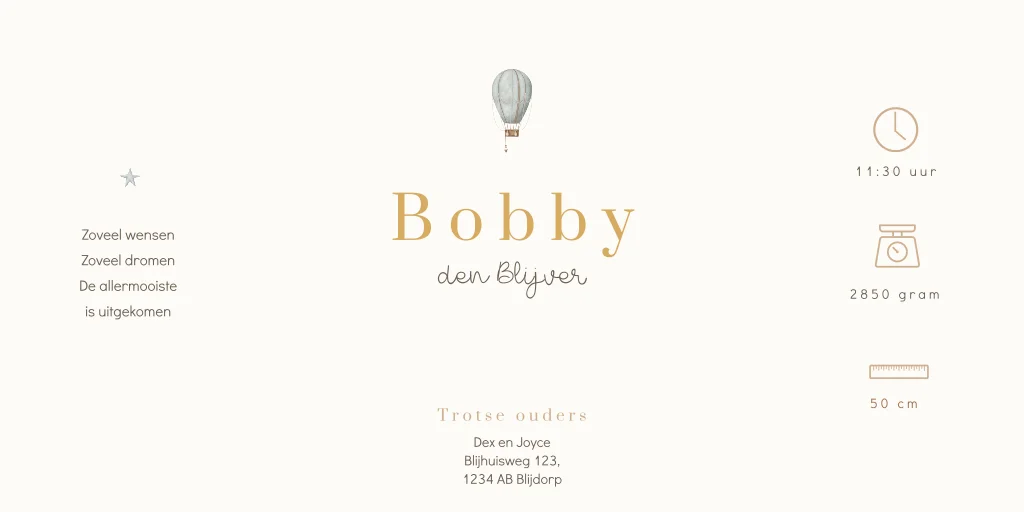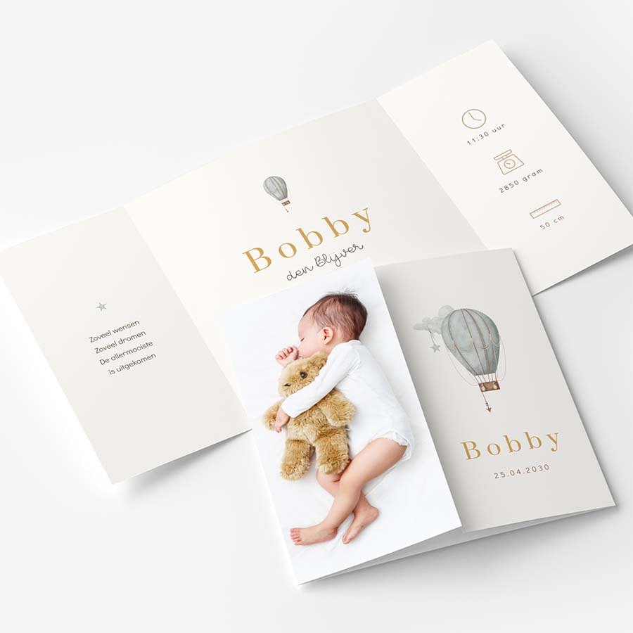 Bekijk hier al onze geboortekaartjes met luchtballon. Wij zijn helemaal fan van dit geboortekaartje! Dit kaartje heeft een theatervouw en mooie beigetinten. Op de voorkant staan de naam en een foto van jullie nieuwe kleintje, met daarbij een prachtige illustratie van een blauwe luchtballon. Bewerk het ontwerp helemaal naar eigen wens in de online editor.
