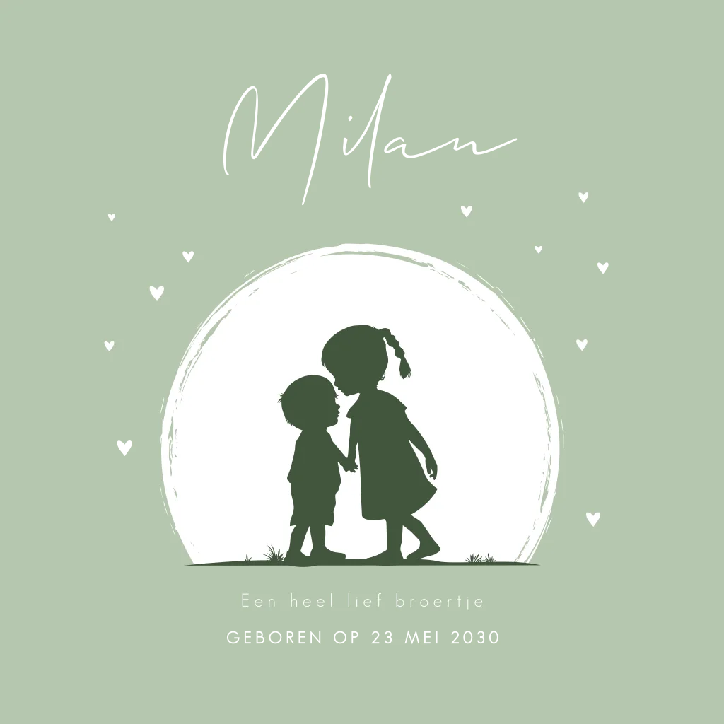 Groen geboortekaartje met silhouetjes van grote zus met klein broertje