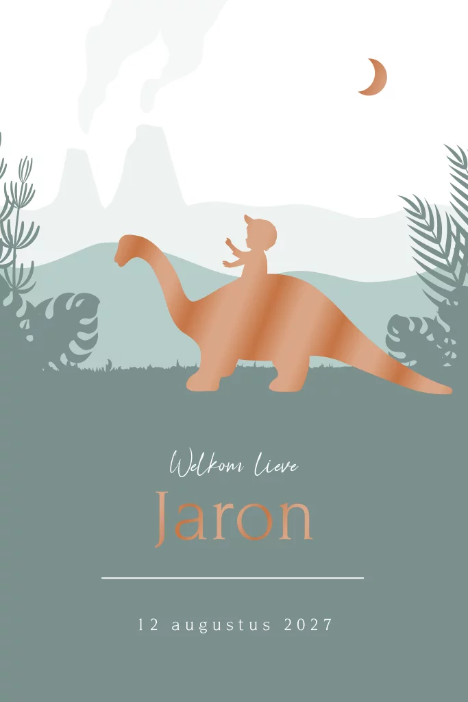 Een hip geboortekaartje voor jullie aanstaande zoontje. Dit stoere kaartje heeft een een silhouetje van een jongetje op een dino. Dit silhouetje is gedrukt in prachtige hoogglans. De achtergrond van het kaartje heeft blauwgroene tinten.