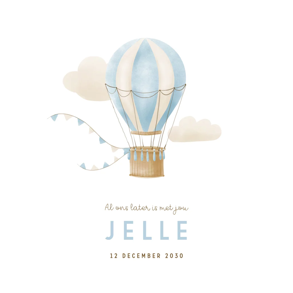 Een schattig geboortekaartje voor jouw zoontje. Dit kaart heeft een witte achtergrond met daarop een lieve blauwe luchtballon. Pas het ontwerp naar wens aan in onze online editor.Dit product maakt onderdeel uit van deze set.