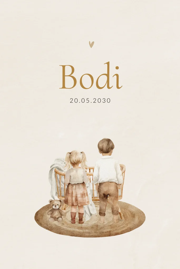 Een stijlvol geboortekaartje voor jouw derde kindje. Het kaartje heeft prachtige natuurlijke kleuren met illustraties van een grote zus en broer bij het wiegje. Pas het ontwerp naar wens aan in onze online editor.