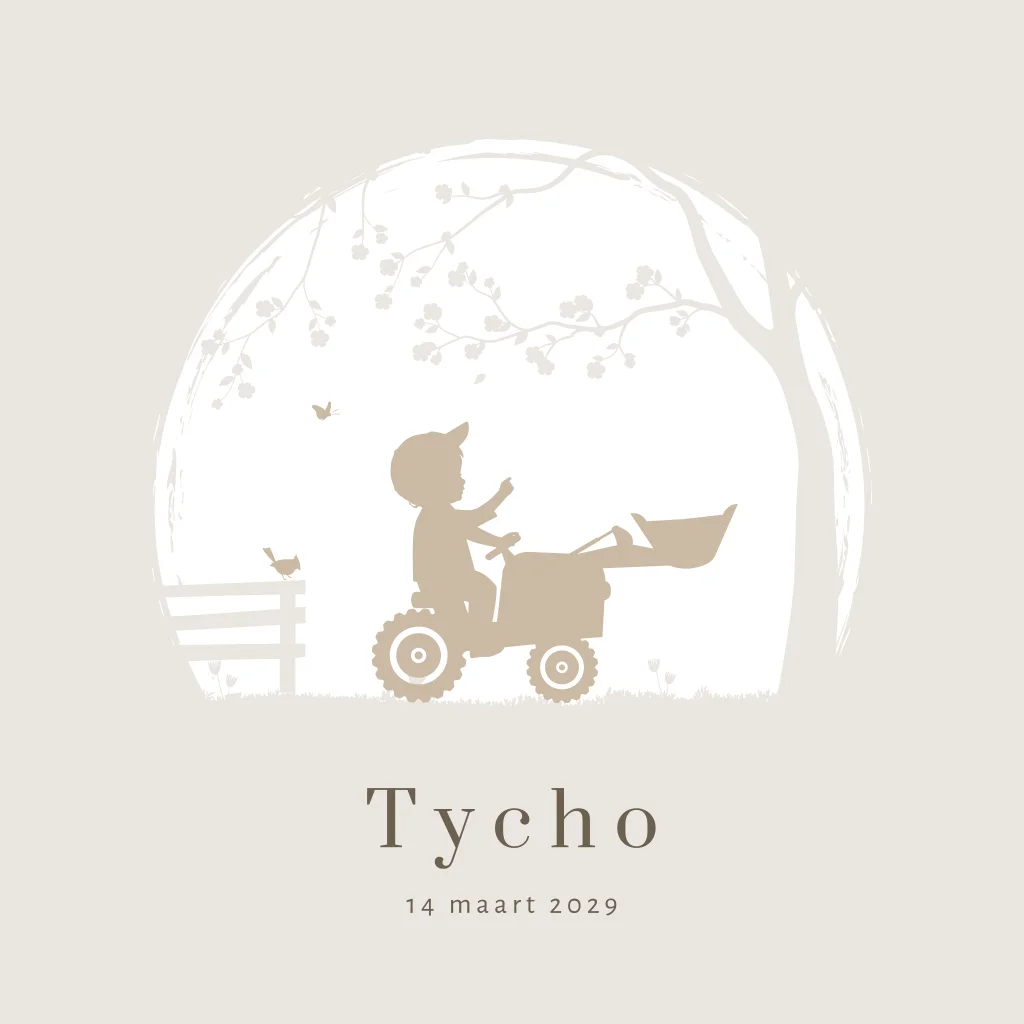 Stoer geboortekaartje met een lieve illustratie van een jongen op een tractor, uitgevoerd in warme beige tinten. Het rustige kleurenpalet geeft het kaartje een natuurlijke en tijdloze uitstraling. Perfect voor ouders die houden van een stoer maar zacht geboortekaartje. Volledig aan te passen in de online editor.