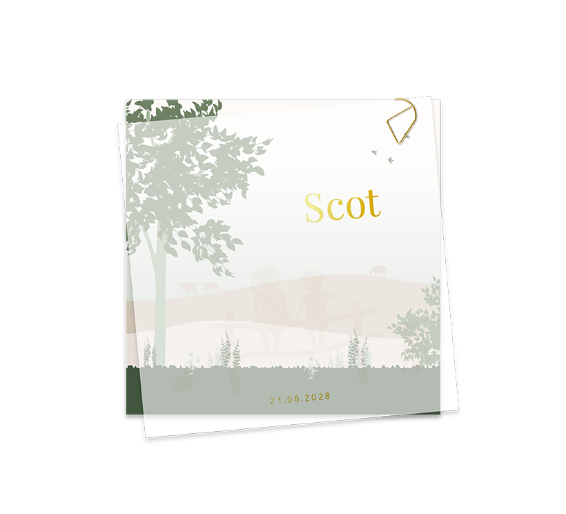 Een lief kaartje met twee silhouetjes op een hekje in de natuur. De naam wordt gedrukt in goudfolie. Goed om te weten: