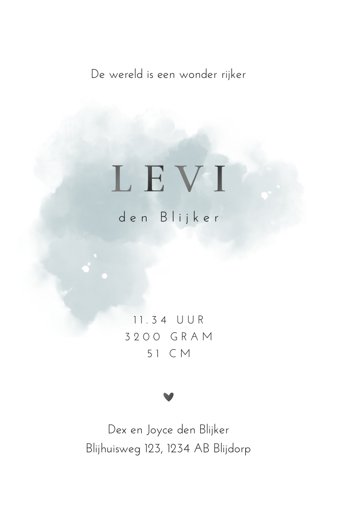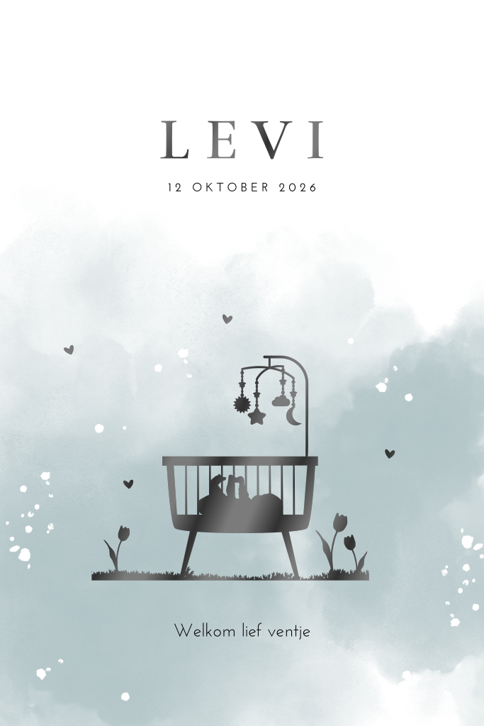 Dit is een stijlvol geboortekaartje voor jullie zoon. Het kaartje heeft een blauwe watercolour achtergrond waartegen het zwart folie silhouet van een baby in een wiegje mooi naar voren komt. De kleine witte en zwart folie hartjes maken dit kaartje helemaal compleet. Bestel snel een proefdruk om dit kaartje in het echt te zien!