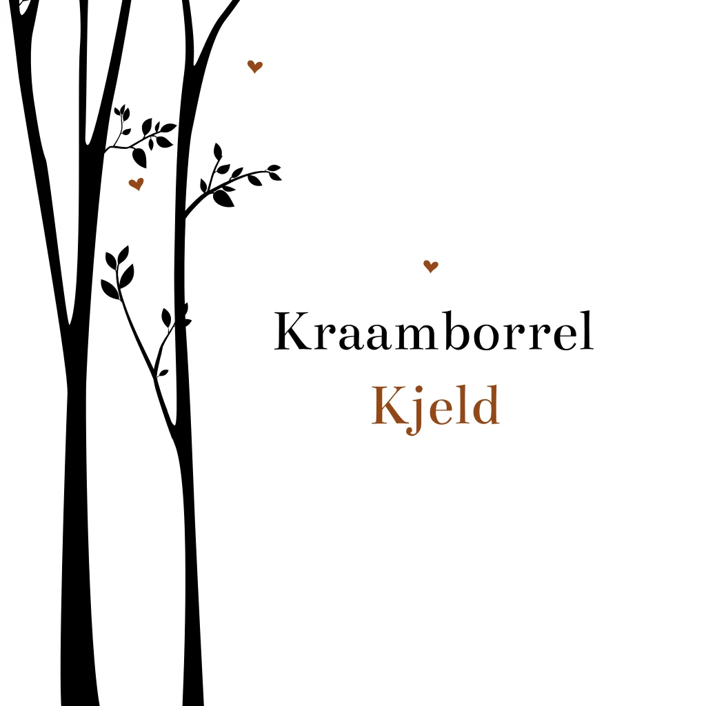 Een lief babyborrelkaartje bijpassend bij het kaartje van jullie kindje. Het kaartje heeft een witte achtergrond met de illustratie van twee bomen en kleine hartjes. Pas het kaartje naar wens aan in de online editor.