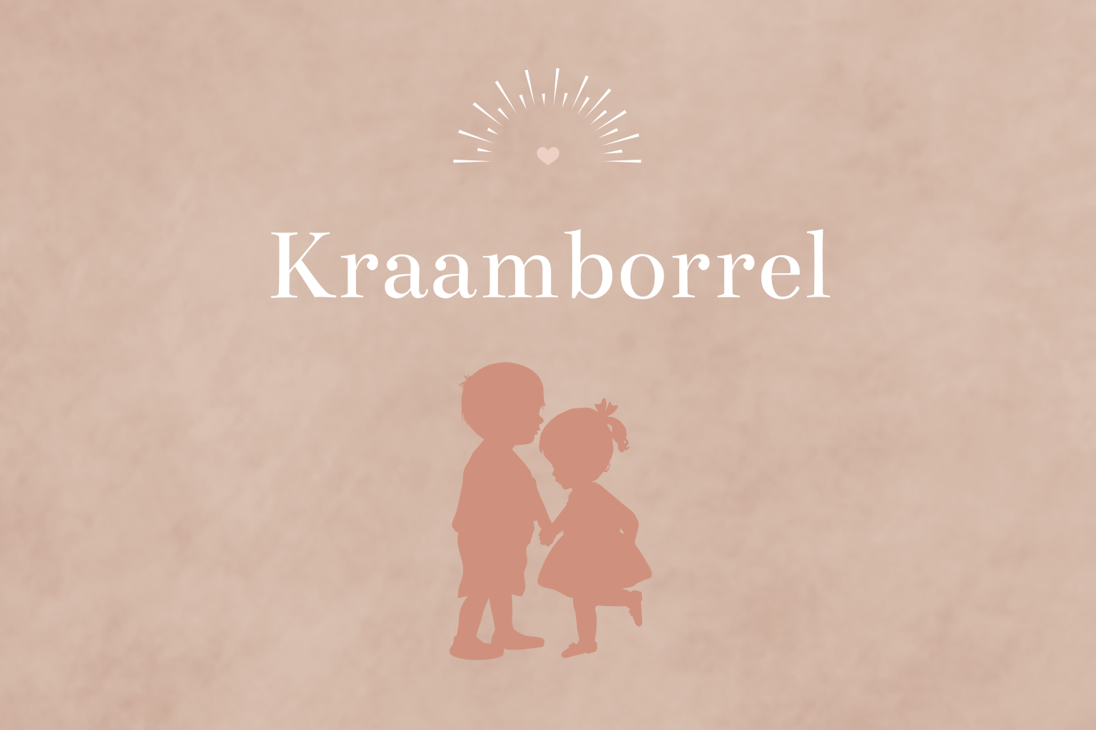 Nodig familie en vrienden uit voor de babyborrel ter ere van de geboorte van jullie dochter met deze stijlvolle kraamborrelkaart. Op de beige velvetachtergrond staat het silhouet in peach-kleur van grote broer die zijn zusje bij de hand neemt. De tekst 'kraamborrel' is in trendy witte letters met een roze hartje met stralenkrans erboven.