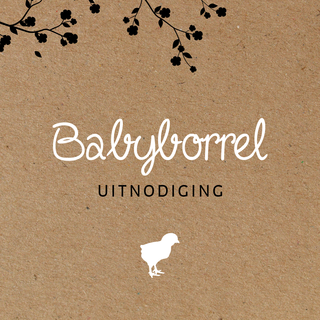 Nodig familie en vrienden uit voor het kraamfeest van jullie dochter met deze kraftlook kraamborrelkaart, stoer! Op de bruine achtergrond staat een zwarte boomtak, babyborrel staat in witte trendy letters en eronder een lief kuikentje.