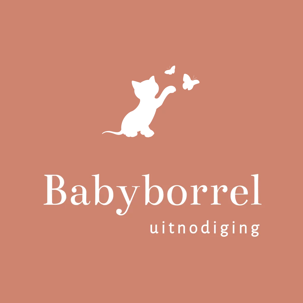 Nodig vrienden en familie uit met deze trendy babyborrel uitnodiging in terracotta kleur. Het spelende katje met de vlinders is in roségoudfolie gedrukt, superlief!