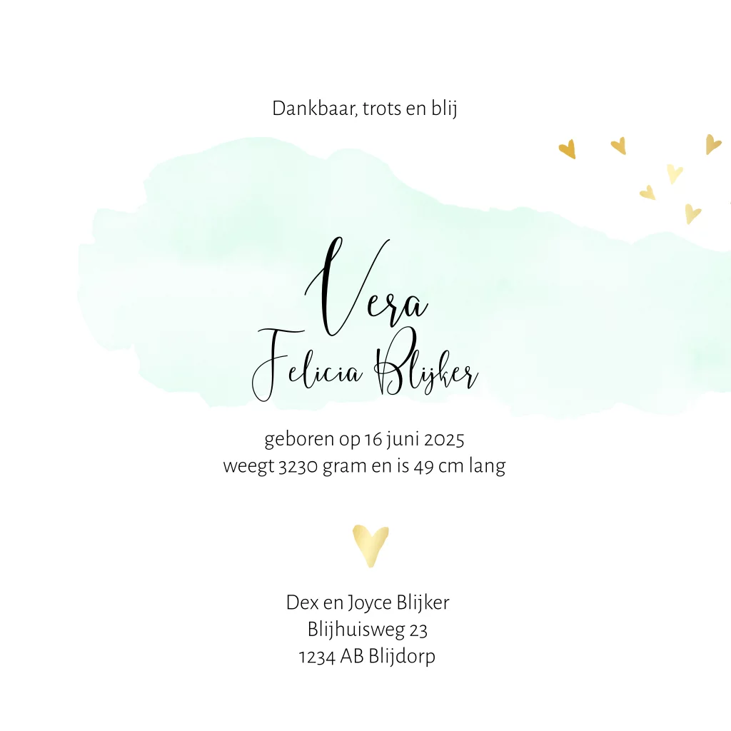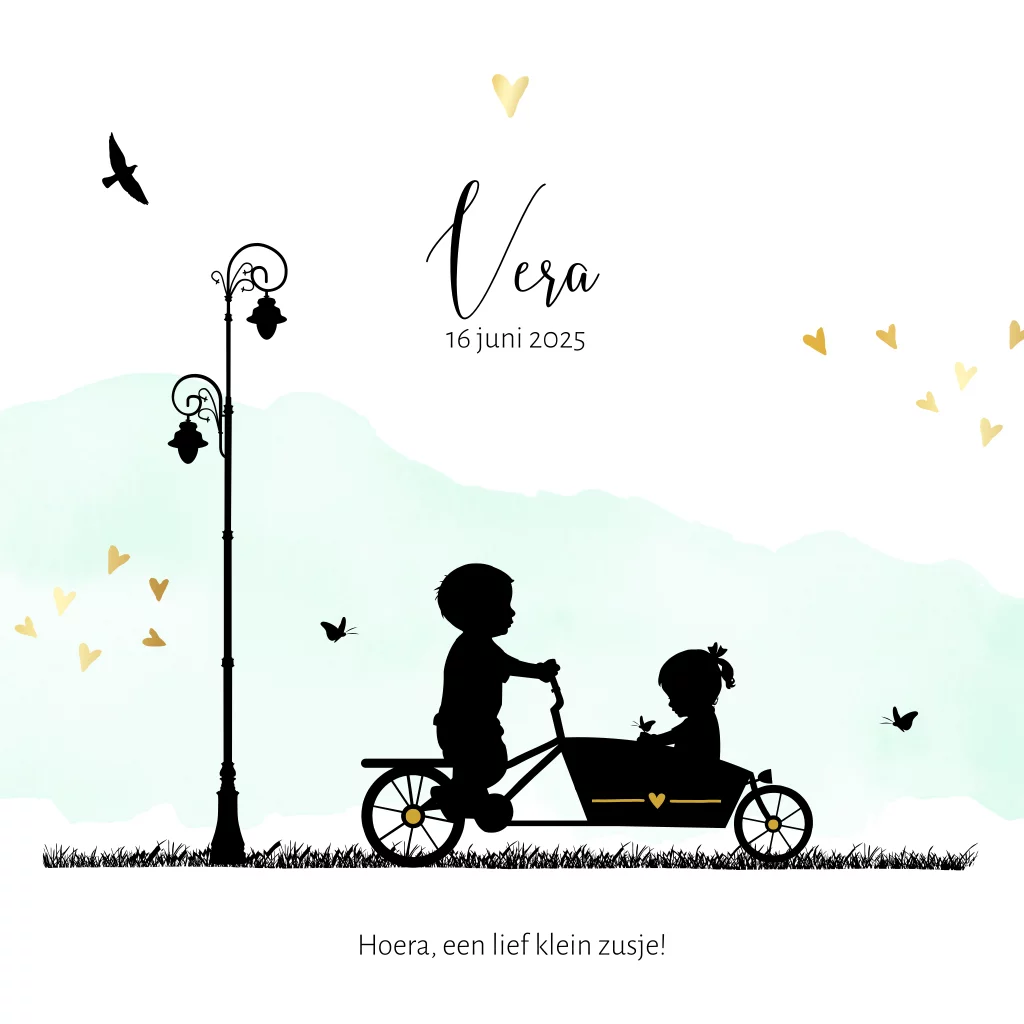 Hoera, een zusje! Het jongetje rijd met een bakfiets met zijn zusje op de fiets. De mintgroene watercolour in combinatie met de goudkleurige hartjes, het vogeltje, de vlinders en de chique lantaarnpaal maakt dit een romantisch babykaartje. Hoe heet jouw 2e kindje?