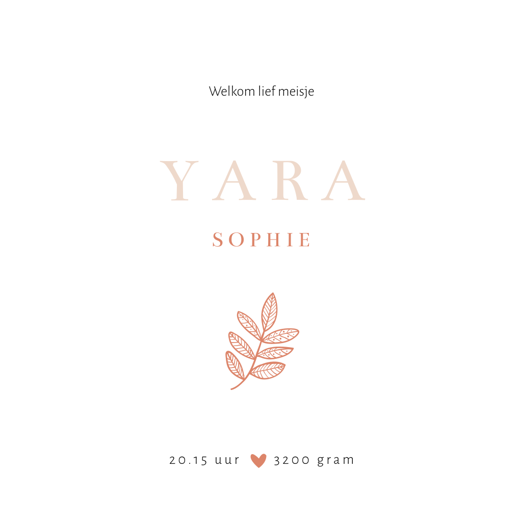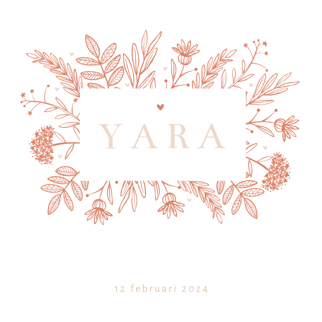 Stijlvol kaartje voor de geboorte van jullie dochtertje. De naam trekt alle aandacht in het midden en wordt omringd met bloemen en takjes met bladeren. Aan de binnenkant komen de elementen van de voorkant terug.
