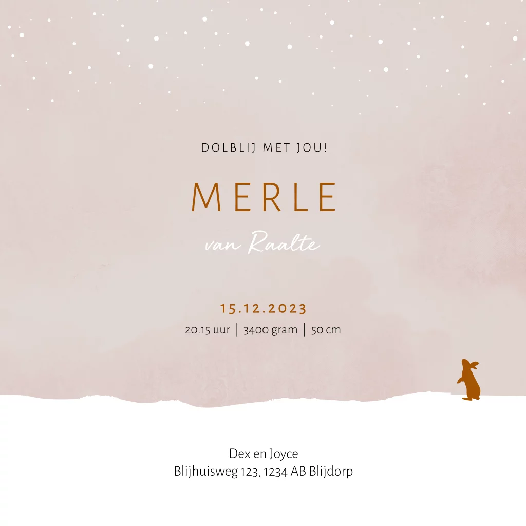 Een stoer geboortekaartje voor een meisje met een winter thema. Met het silhouet van een meisje op een bakfiets in de sneeuw, een eekhoorntje en konijntje. Een sfeervol kaartje met warme kleuren voor de winter!