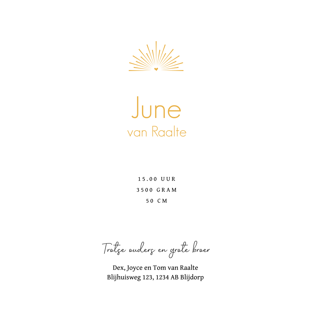 Een lief kaartje voor de geboorte van jullie tweede kindje. De silhouetjes op dit ontwerp stellen jullie pasgeboren dochtertje voor, samen met haar grote broer. Deze zijn okergeel gekleurd. Samen gaan ze op avontuur.