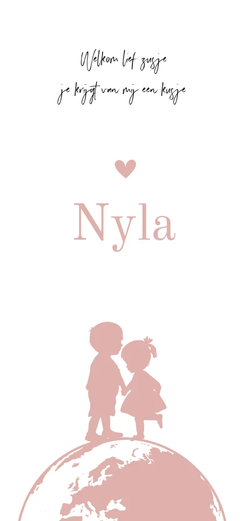 Een stoer en lief geboortekaartje voor jullie tweede kindje. Op dit langwerpige witte kaartje staan silhouetjes van een broer en een zusje op een wereldbol in oudroze.