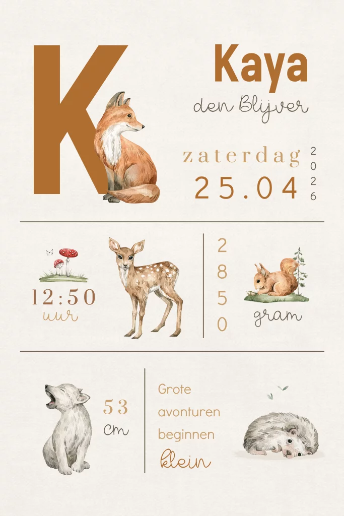 Een schattig staand geboortekaartje voor jouw kindje. Het kaartje heeft een beige achtergrond met daarop lieve bosdieren. Om de diertjes heen zie je de verschillende geboortegegevens van jouw kindje. Pas het ontwerp naar wens aan in onze online editor.