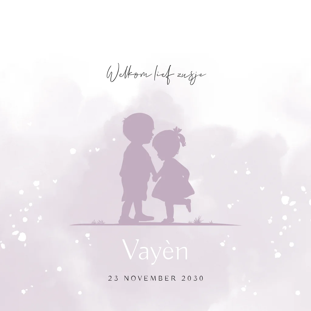Kondig de geboorte van jullie dochter en zusje aan met dit lieve kaartje! Het kaartje heeft een mooie paarse watercolour achtergrond. Centraal op het kaartje staan de silhouetjes van een grote broer met zijn kleine zusje. De goudfolie opdruk maakt dit kaartje extra speciaal. Pas het kaartje naar wens aan in onze online editor. Helemaal tevreden? Bestel snel een proefdruk om dit kaartje in het echt te zien!