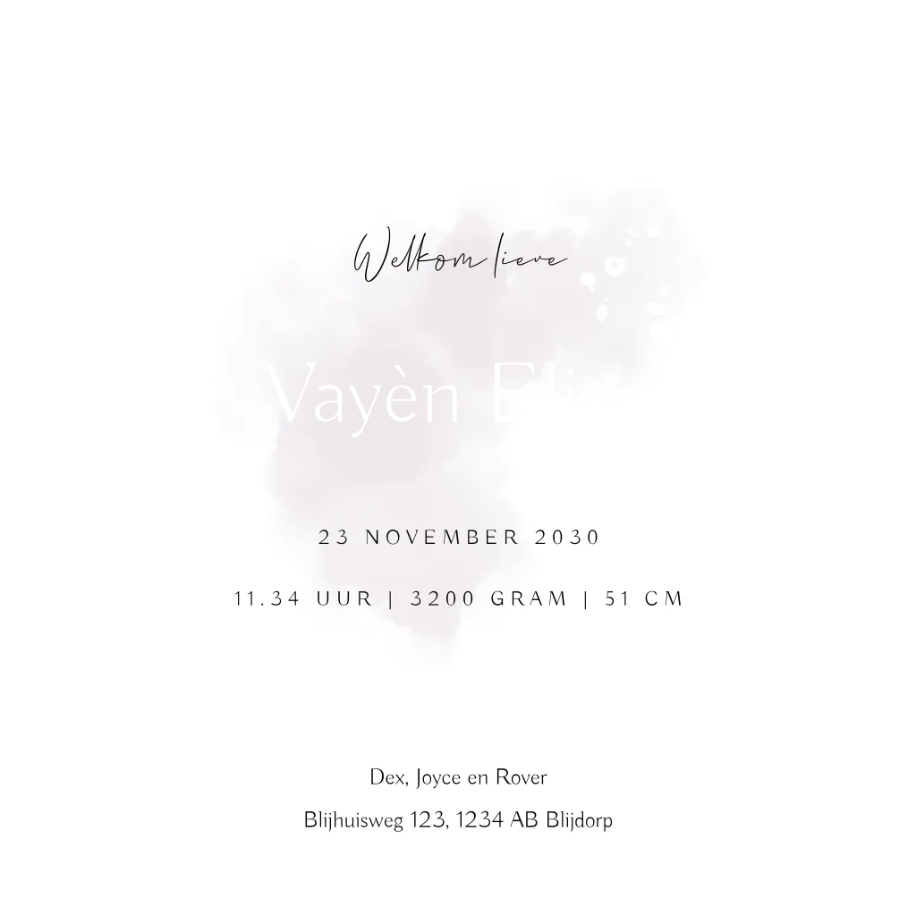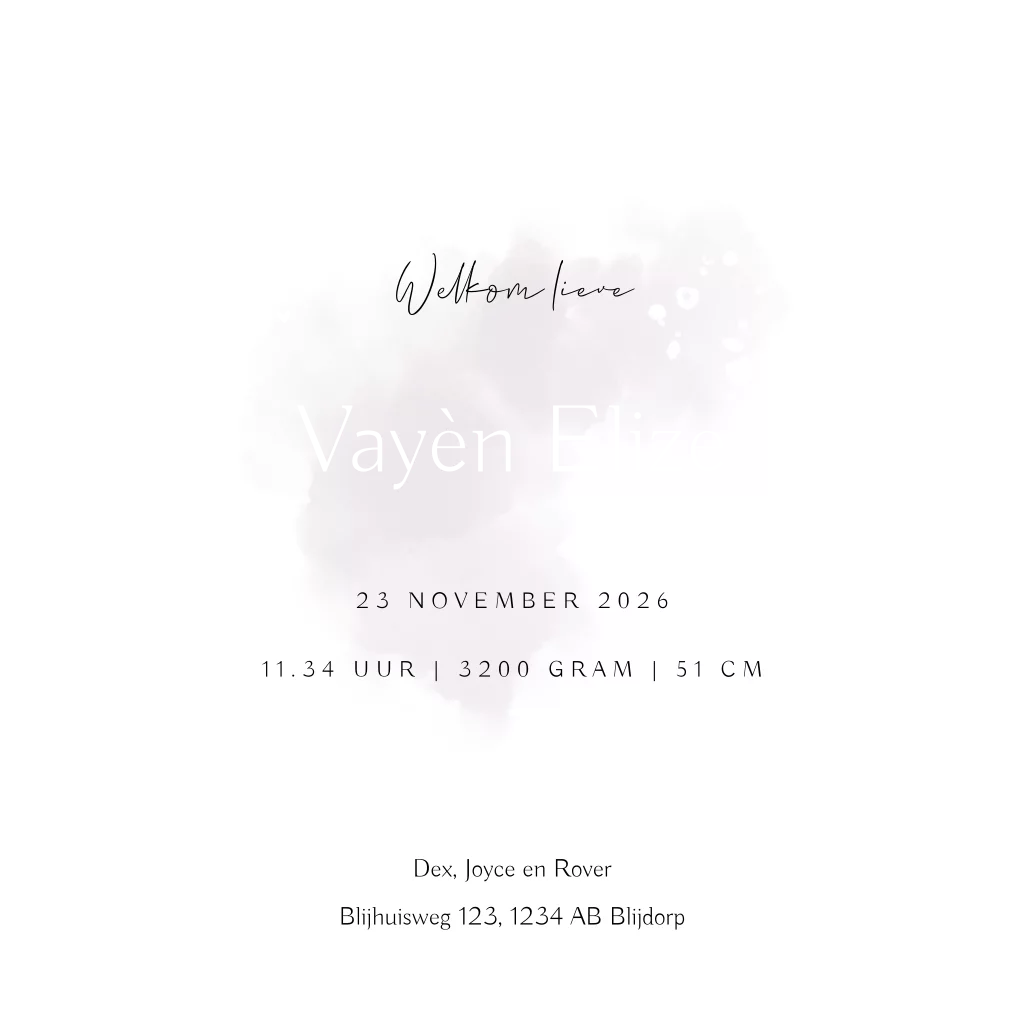 Paars watercolour geboortekaartje met goudfolie voor een zusje