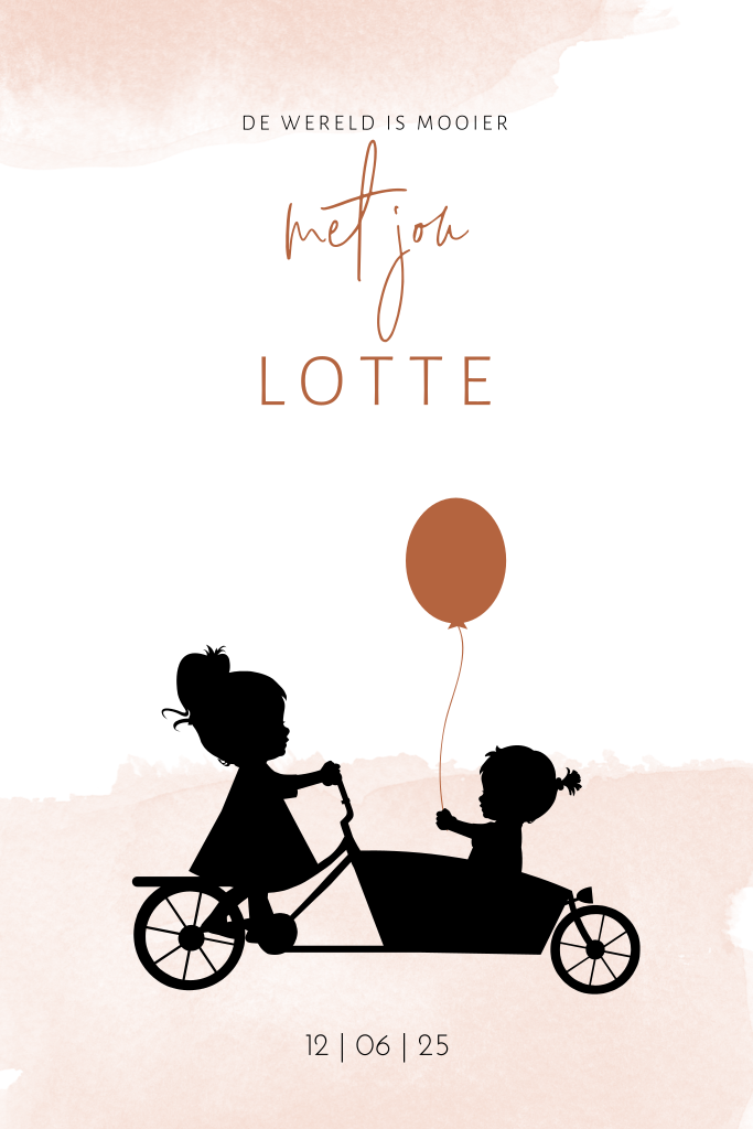 Trendy geboortekaartje voor je tweede dochtertje met een hip silhouet met een grote zus en een baby zusje in de bakfiets op een roze waterverf achtergrond.