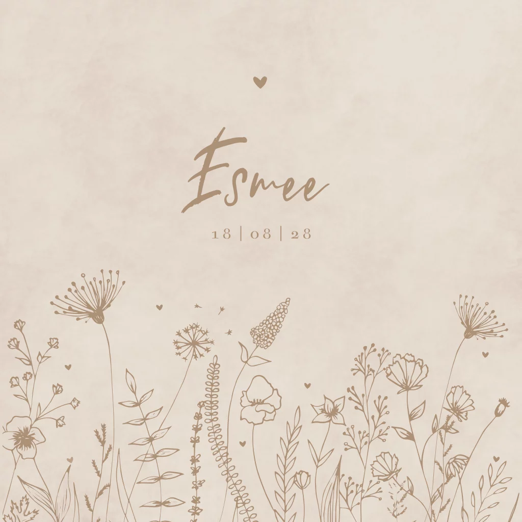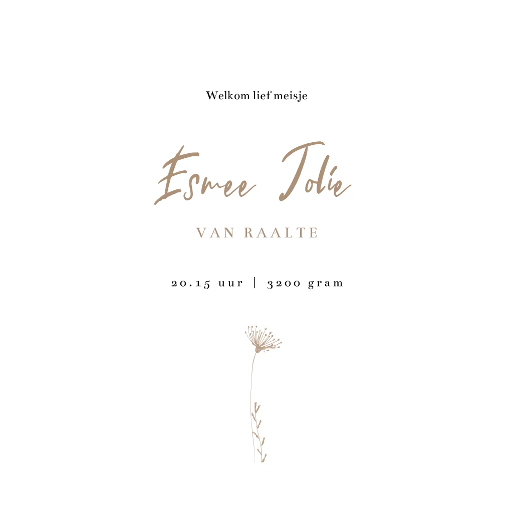 Kondig de geboorte van je dochter aan met dit lieve kaartje. Het kaartje heeft een beige achtergrond met de bruine illustraties van bloemen. Pas het kaartje helemaal naar wens aan in onze online editor.