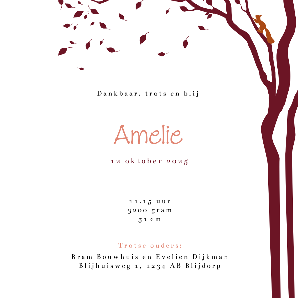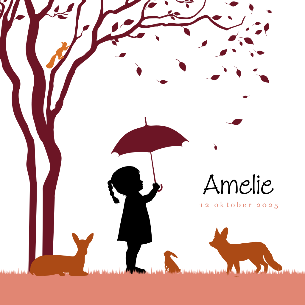 Hip geboortekaartje in herfst thema voor de geboorte van je dochtertje. Met een hip silhouet van een meisje onder een paraplu in het bos met bosdieren zoals een hertje, een konijntje en een vosje.