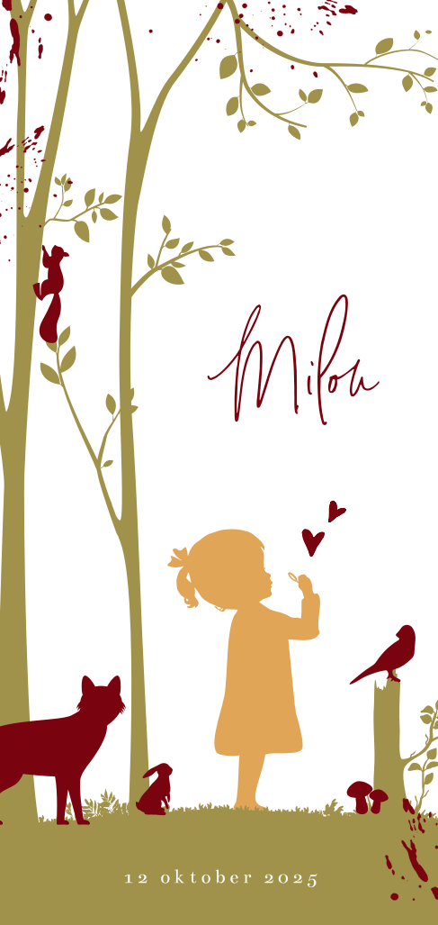 Hip geboortekaartje voor je dochtertje die in de herfst geboren wordt. Met hippe silhouetten van bosdieren en een meisje samen in het bos.
