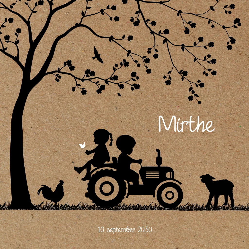 Silhouet geboortekaartje met zusje en grote broer op de traktor