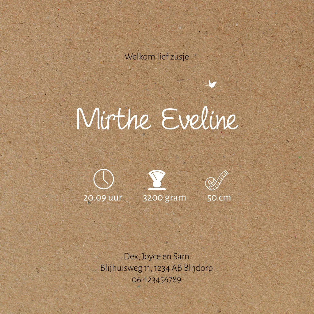 Stoer kraft papier-look geboortekaartje voor een meisje met een hip silhouet van een grote broer met zijn baby zusje samen op de trekker onder een boom.