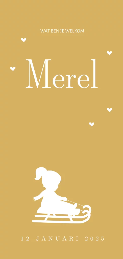 Wordt jouw dochter in de winter geboren? Dan is dit geboortekaartje in winterthema echt wat voor jou! Met een schattig silhouet van een meisje op de slee op een goudkleur achtergrond.
