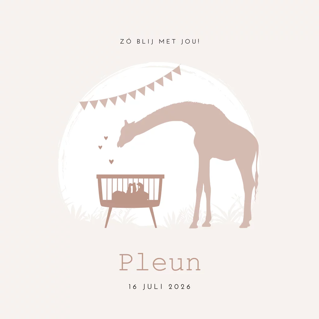 Kondig de geboorte van jullie dochtertje aan met dit lieve kaartje! Centraal op het kaartje staat een witte zon waartegen de silhouetjes van een giraffe en baby in het wiegje mooi naar voren komen. De slingers maken dit kaartje extra feestelijk. Pas het kaartje aan in onze online editor!