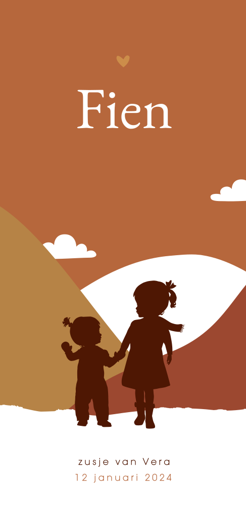 Stoer geboortekaartje voor een meisje, met lief silhouetje van twee zusjes in de bergen met sneeuw en wolkjes. Een sfeervol kaartje met warme kleuren voor de winter.