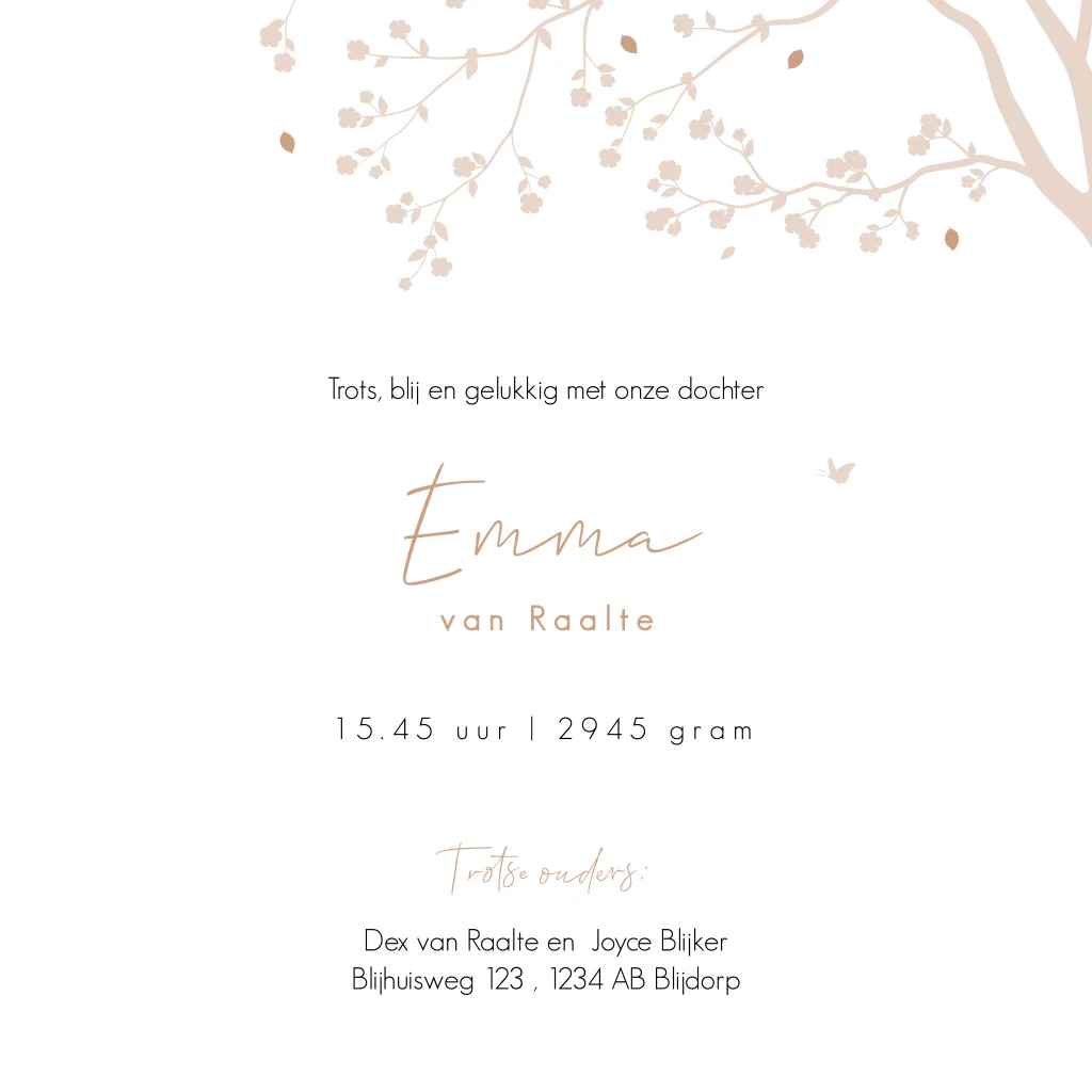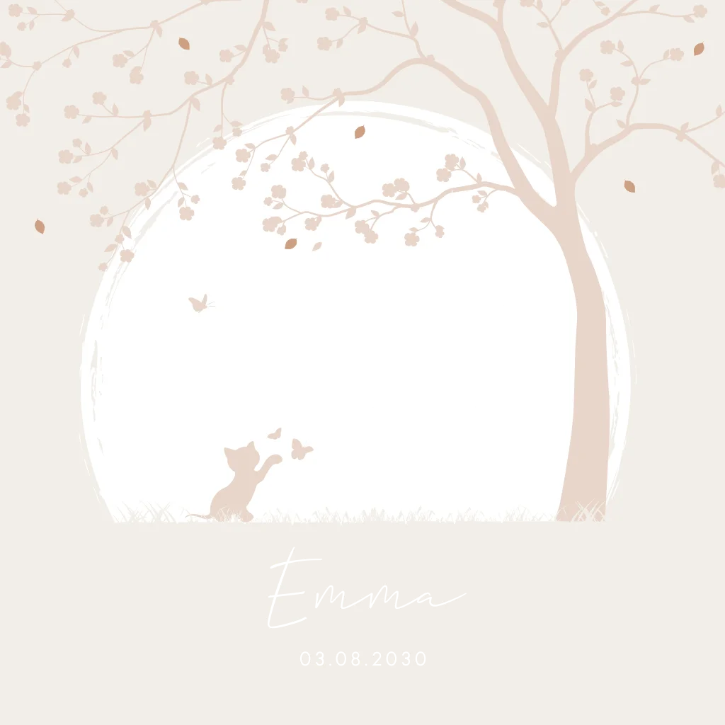 Een schattig silhouet geboortekaartje voor een meisje. Op het kaartje zie je een meisje op een schommel aan een boom. Daarnaast zie je een lief silhouetje van een poesje. Het kaartje heeft zachte aardekleuren en is volledig te personaliseren in onze online editor.