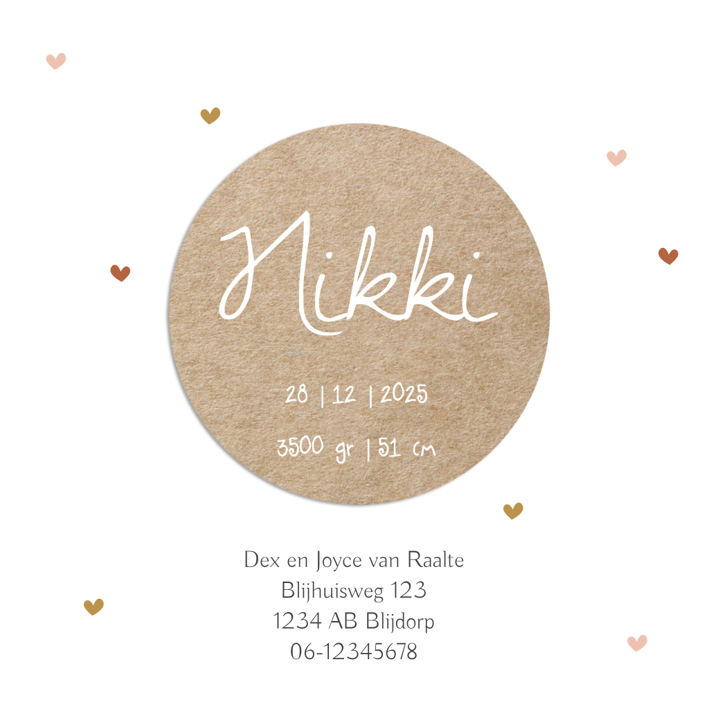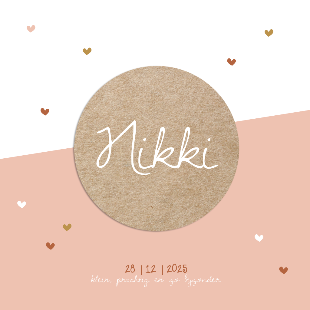 Stoere geboortekaart voor je pasgeboren dochter met een groot peach-kleurig vlak en een kraft-look cirkel waar je de naam van je dochtertje kunt neerzetten. De hartjes in roestbruin en okergeel maken dit kaartje echt uniek!