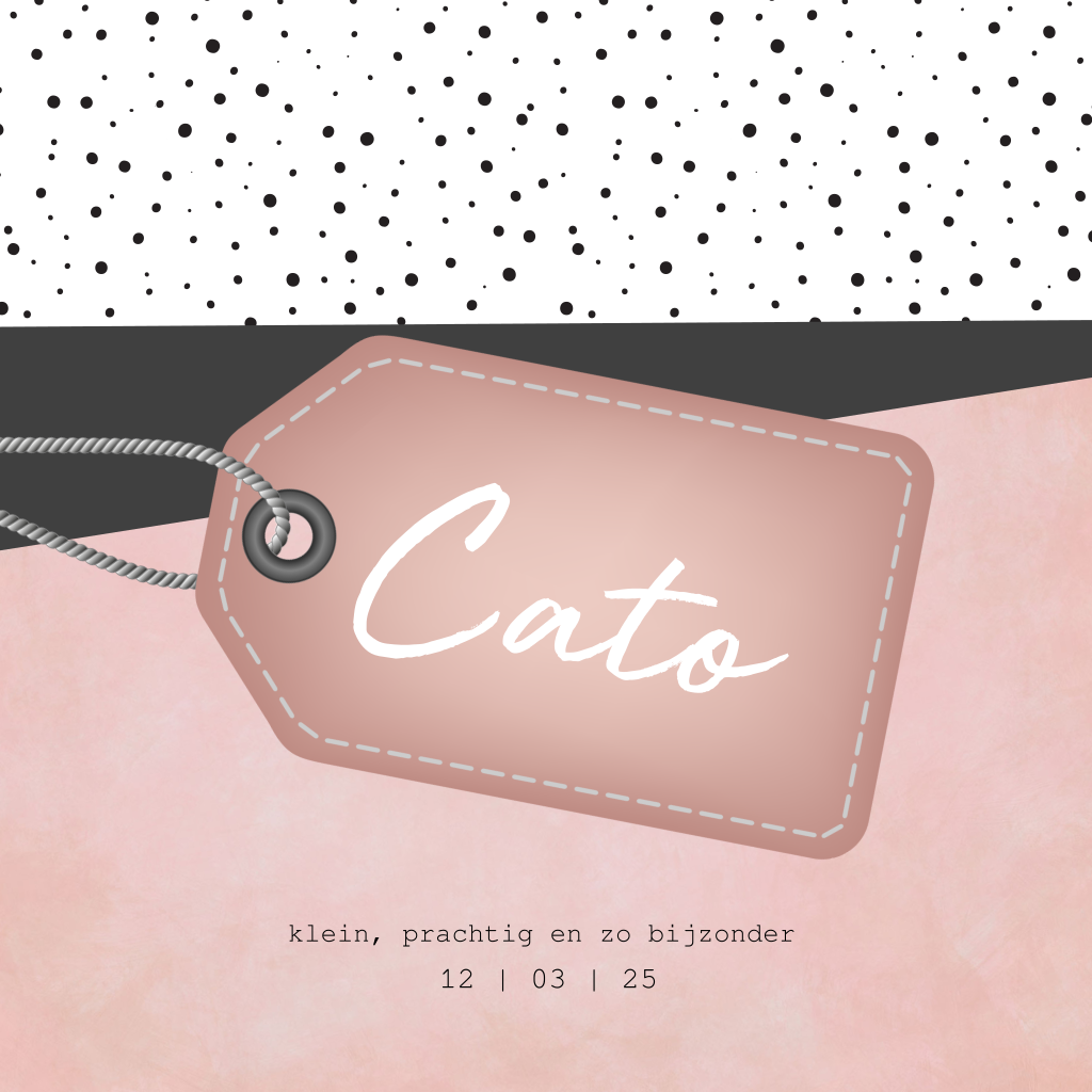 Stoere geboortekaart voor je dochtertje met geometrische vlakken in kleuren zoals roze, zwart en stipjes. Het roze labeltje met babynaam maakt dit geboortekaartje echt hip!