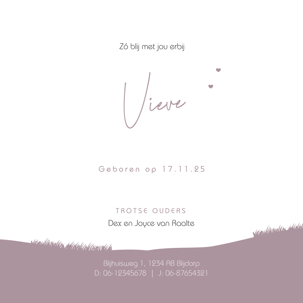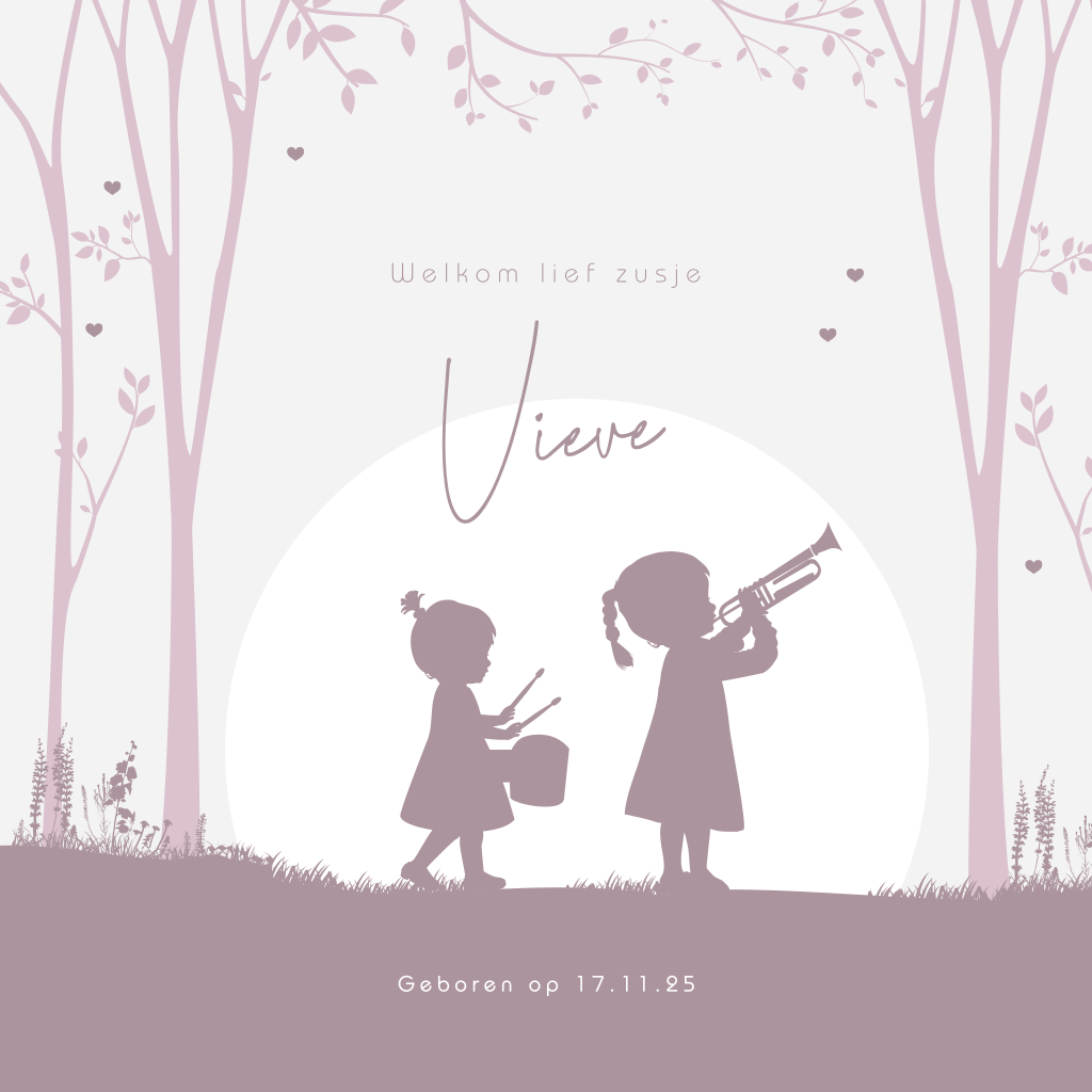 Dit is een lief kaartje om de geboorte van jullie dochtertje en zusje mee aan te kondigen. De silhouetjes bespelen muziekinstrumenten. Pas het kaartje naar wens aan in de online editor.