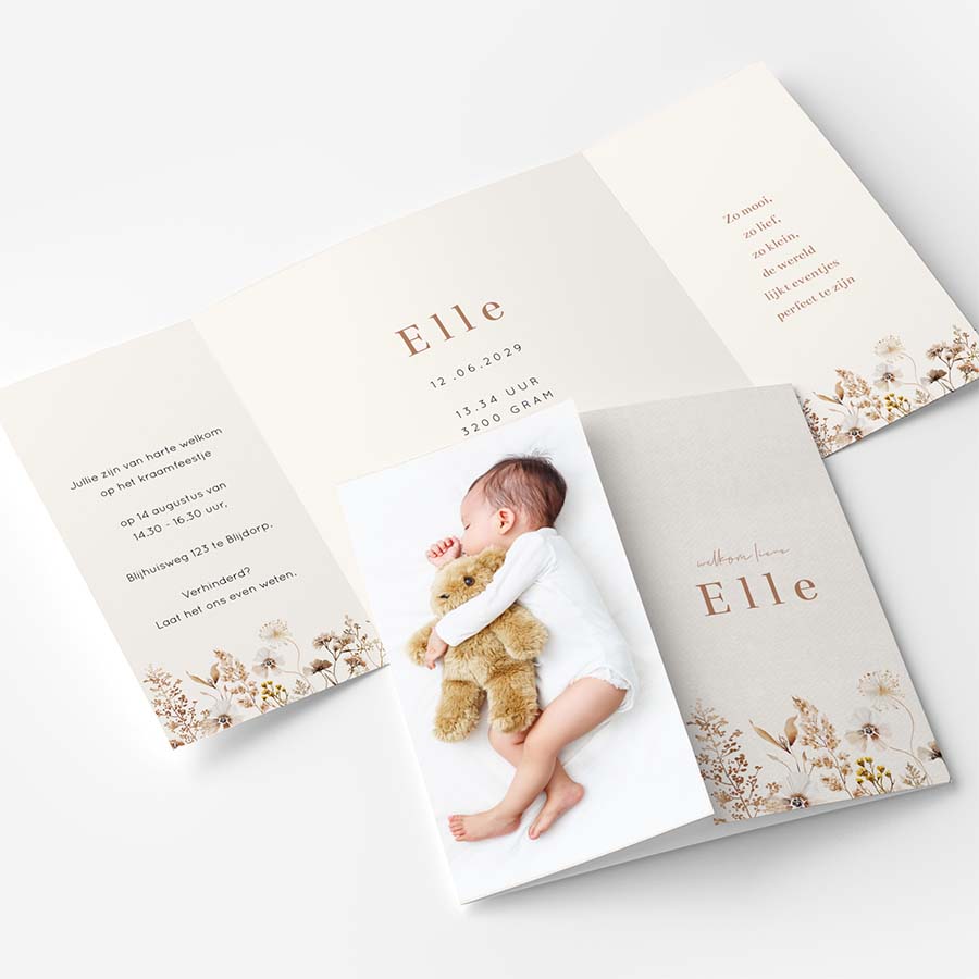 Wat een prachtig geboortekaartje is dit! Dit kaartje met theatervouw in aardetinten heeft een ontwerp van veldbloemen en een foto van jullie kleintje. Bewerk het ontwerp naar wens in de editor.