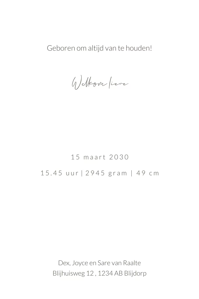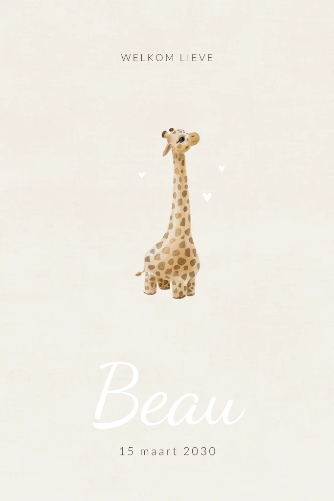 Een schattig geboortekaartje met de illustratie van een giraffe. De typografie en details worden gedrukt in goudfolie, wat het kaartje helemaal af maakt. Pas het het kaartje gemakkelijk in onze online editor aan.