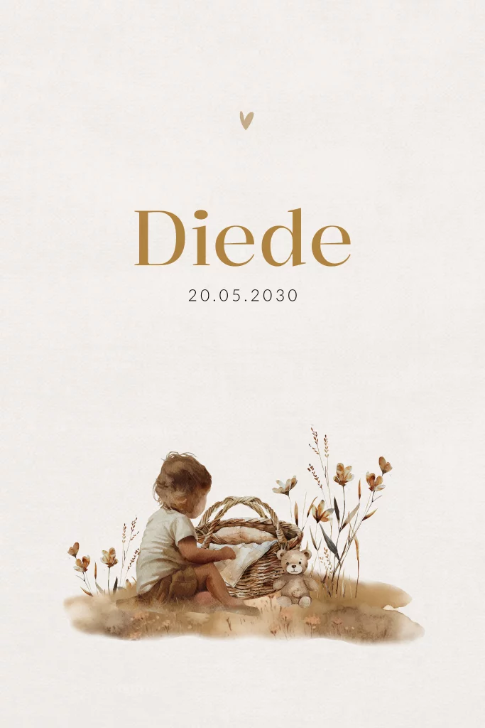 Wat een lief geboortekaartje voor jullie kindje. Het kaartje heeft prachtige illustraties van een kindje in het gras naast een mandje en bloemen. Pas het ontwerp naar wens aan in onze online editor.