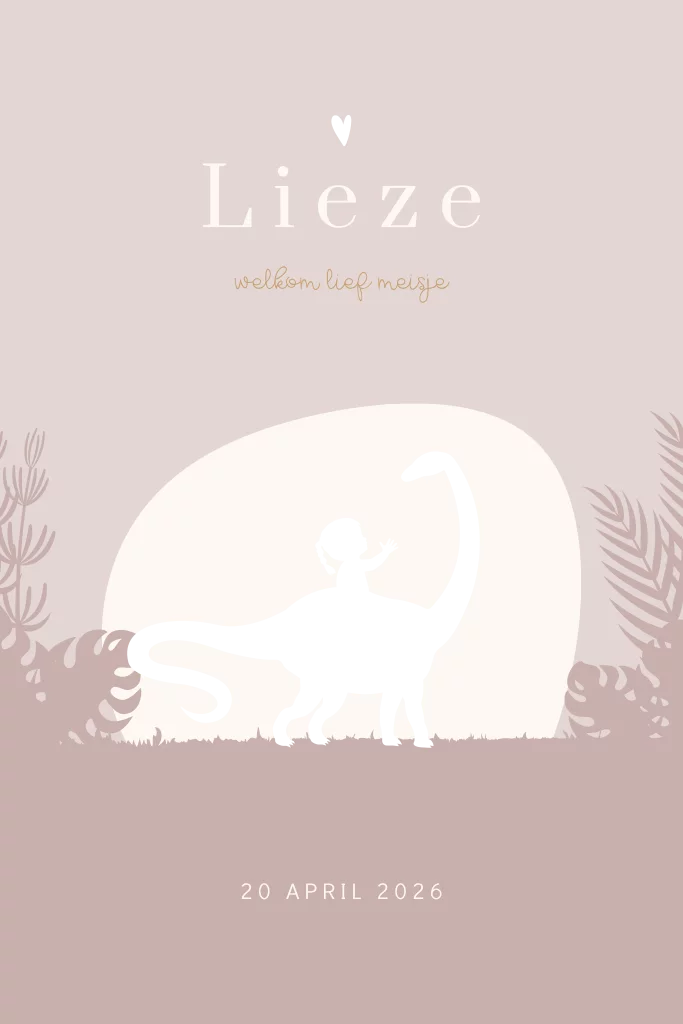 Een trendy dino geboortekaartje voor een meisje. Op dit kaartje zie je een meisje boven op een dino zitten. Dit hele silhouetje is gedrukt in roségoudfolie. De achtergrond van het kaartje heeft een oudroze kleur.