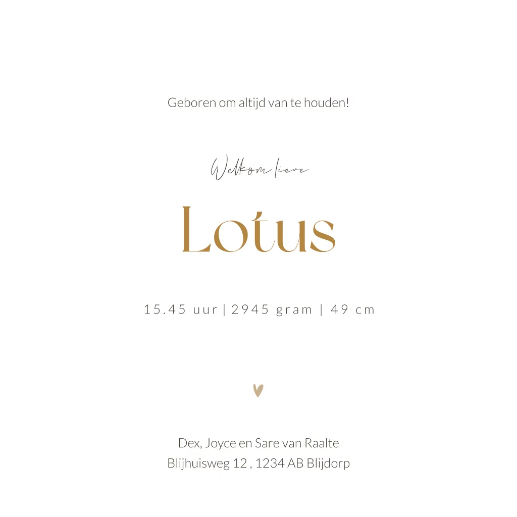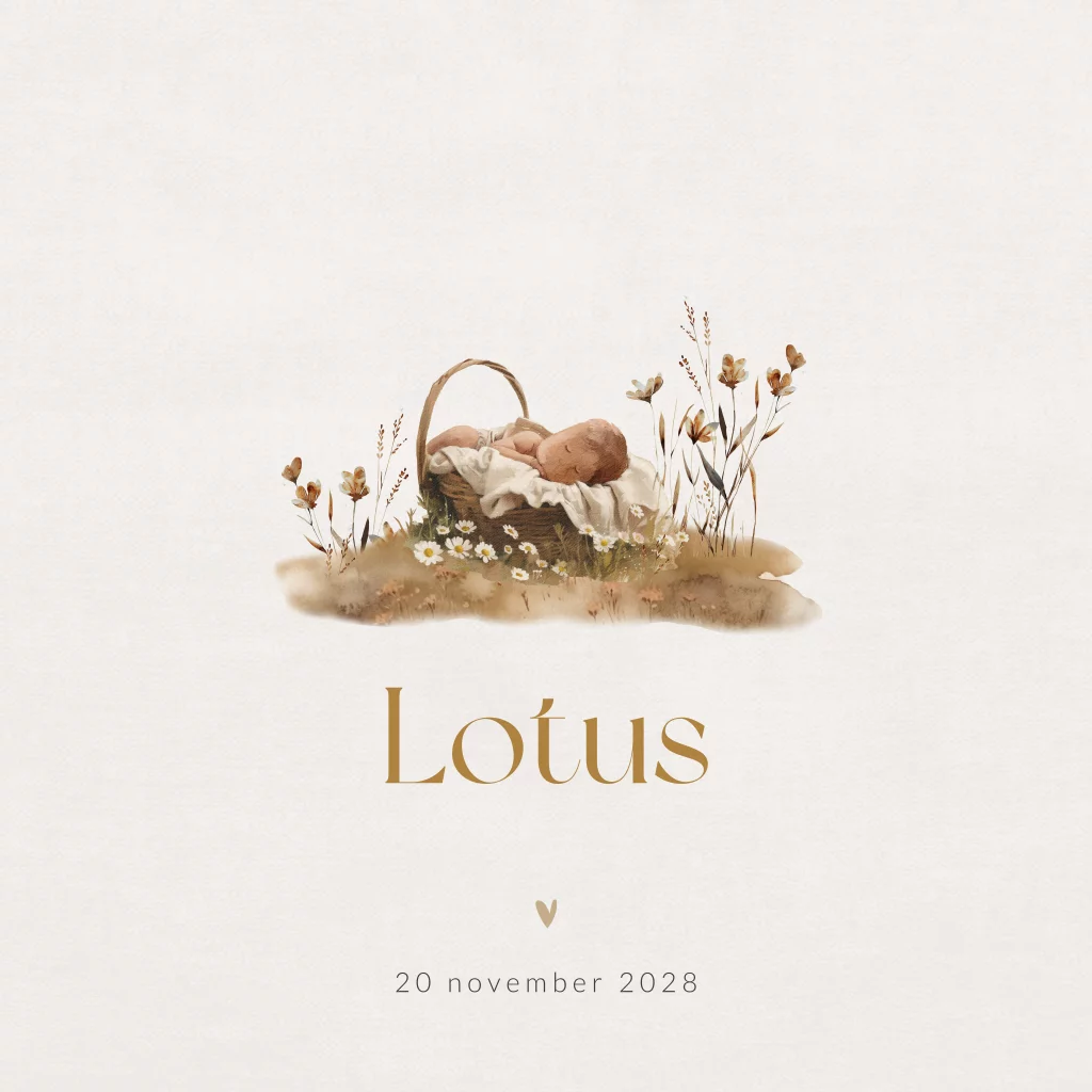 Wat een lief geboortekaartje voor jullie kindje. Het kaartje heeft prachtige illustraties van een mandje in het gras en tussen de bloemen. Pas het ontwerp naar wens aan in onze online editor.