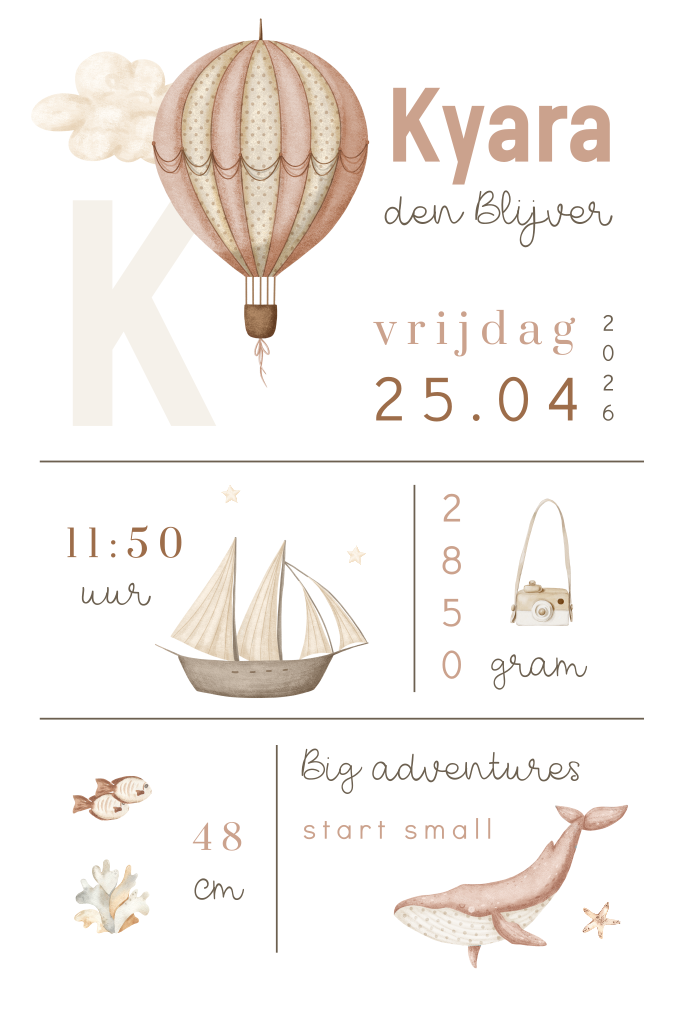 Lief geboortekaartje meisje met geboortegegevens en illustraties