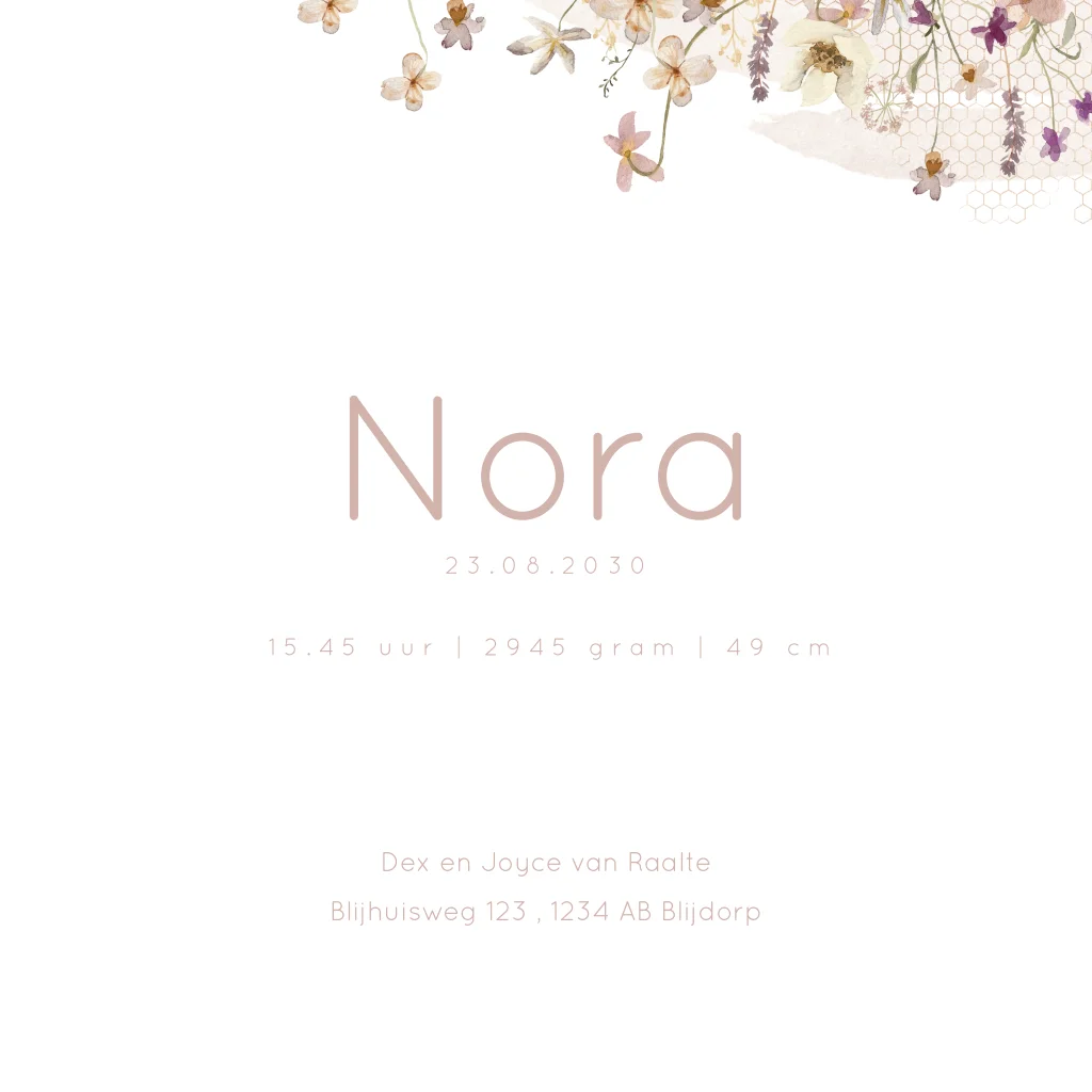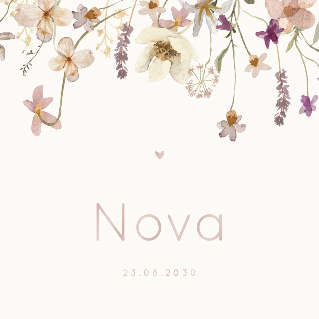 Een lief geboortekaartje voor jouw meisje. Het kaartje heeft een vierkant formaat met daarop prachtige illustraties van verschillende veldbloemen. Pas het ontwerp naar wens aan in onze online editor.