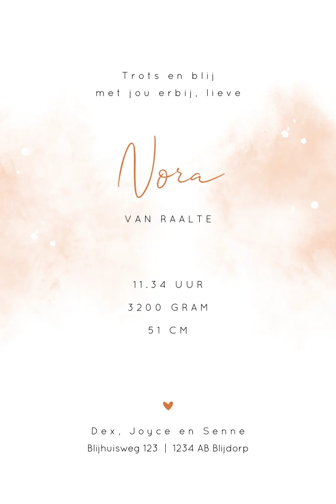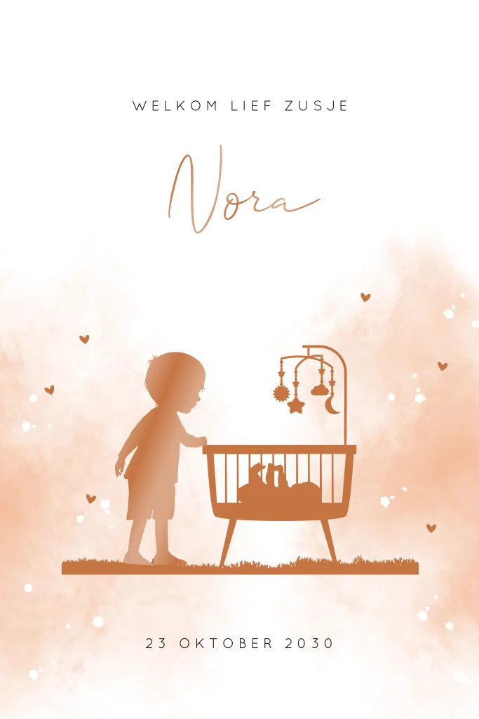 Kondig de geboorte van jullie dochter en zusje aan met dit prachtige kaartje. Het kaartje heeft een watercolour achtergrond. Centraal op het kaartje staat het hoogglans silhouetje van een grote broer bij de wieg van zijn zusje. De kleine witte en hoogglans hartjes maken dit kaartje helemaal af. Bestel snel een proefdruk om dit kaartje in het echt te bewonderen!