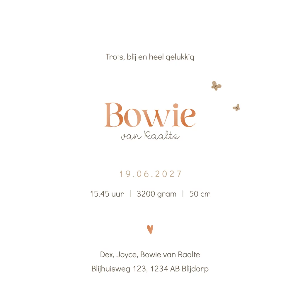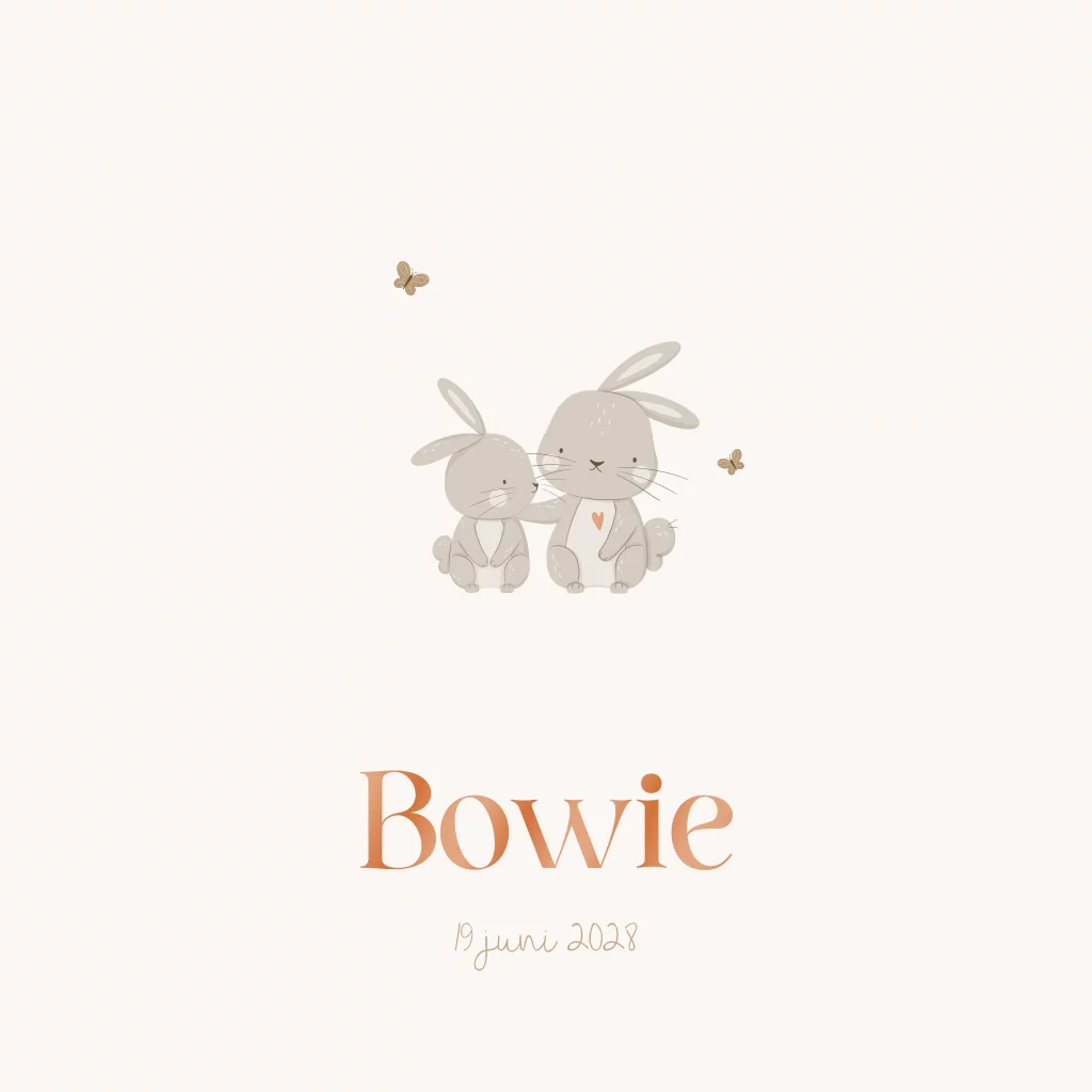 Lief geboortekaartje minimalistisch met konijntjes en koperfolie