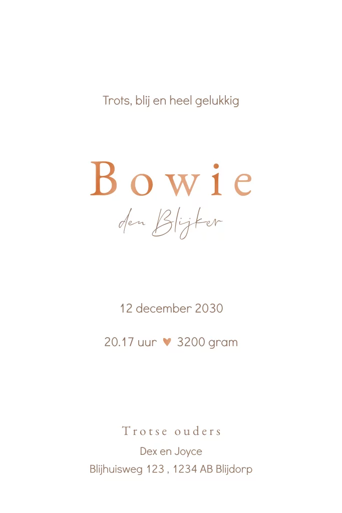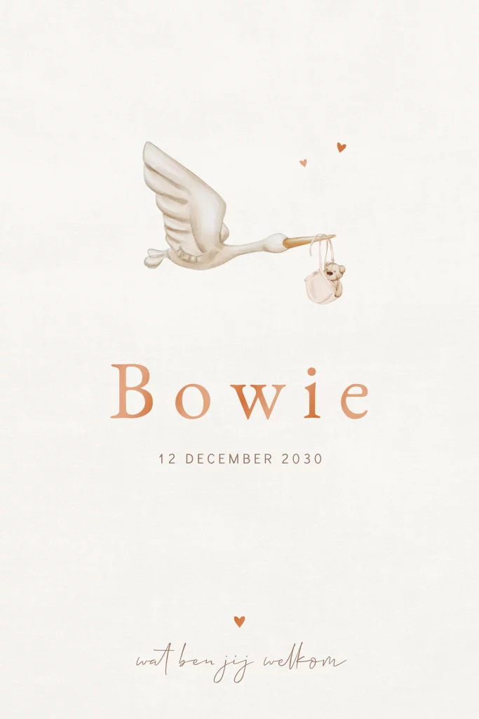 Een stijlvol en lief geboortekaartje voor jouw kindje. Het kaartje heeft een schattige illustratie van een ooievaar. De naam wordt gedrukt in hoogglans. Pas het ontwerp naar wens aan in onze online editor.