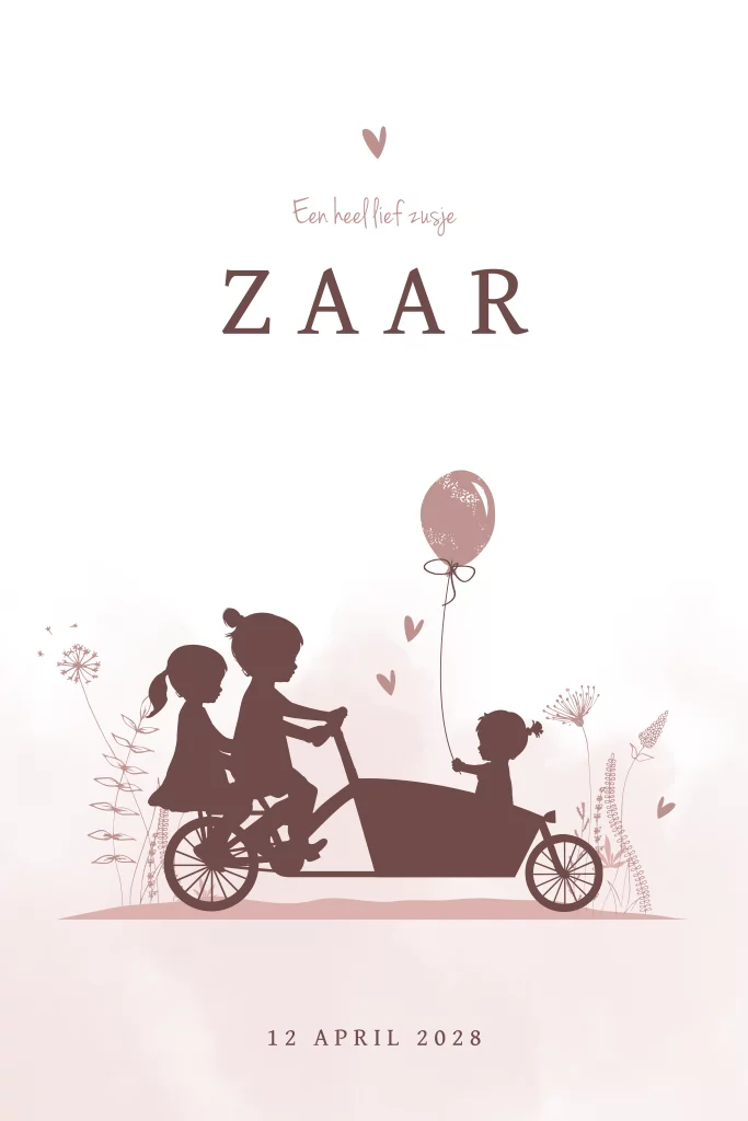 Lief geboortekaartje zusje met silhouetjes en roze watercolour