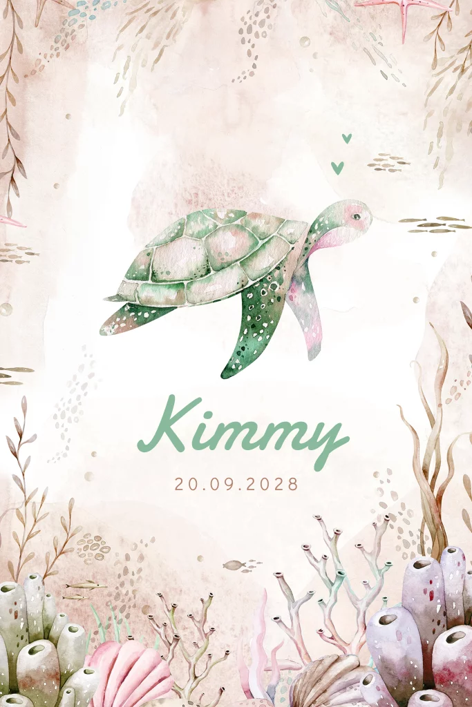 Een kleurrijk geboortekaartje voor jouw meisje. Het kaartje heeft vrolijke kleurrijke tinten met in het midden een illustratie van een schildpad. Pas het ontwerp naar wens aan in onze online editor.