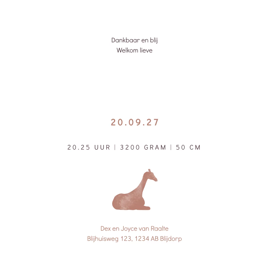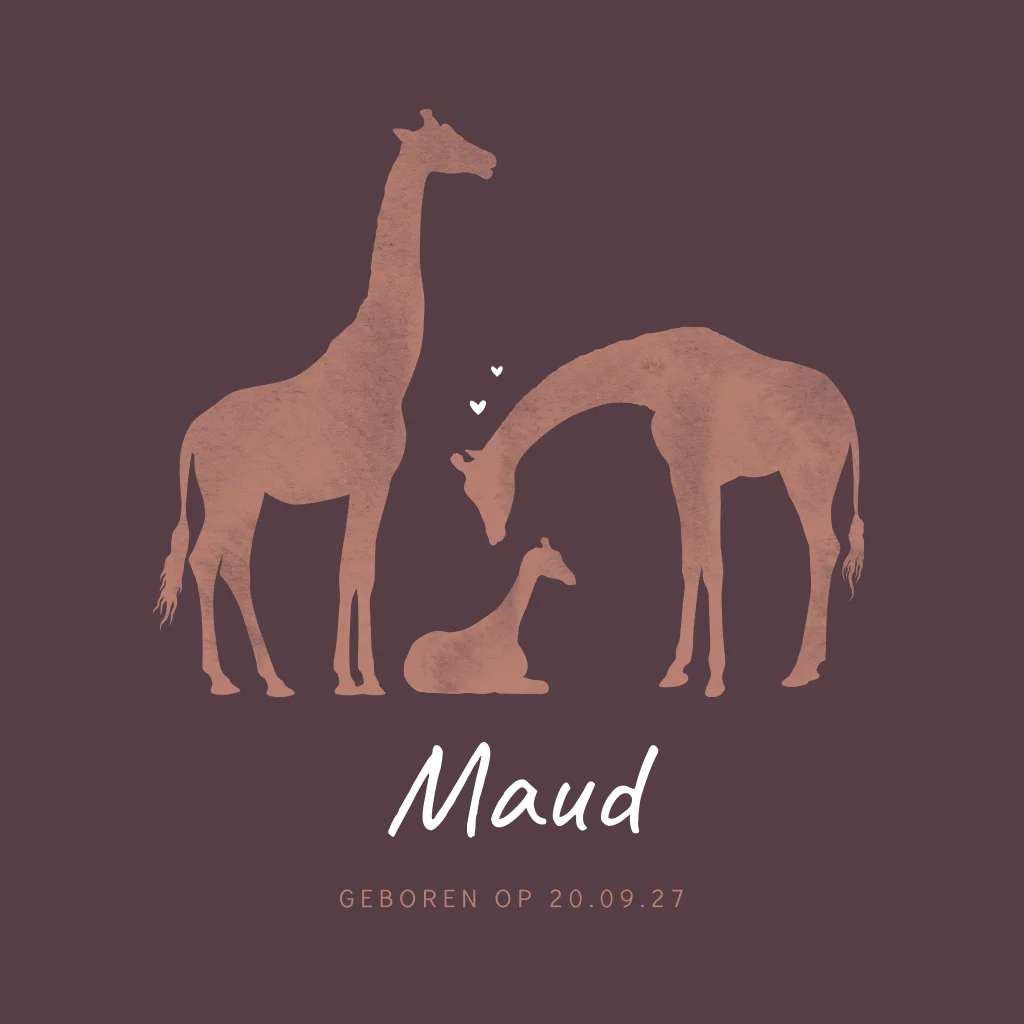 Een stoer en lief geboortekaartje voor jouw dochter. Het kaartje heeft een paarse achtergrond met daarop drie silhouetjes van giraffen. De naam wordt gedrukt in goudfolie.