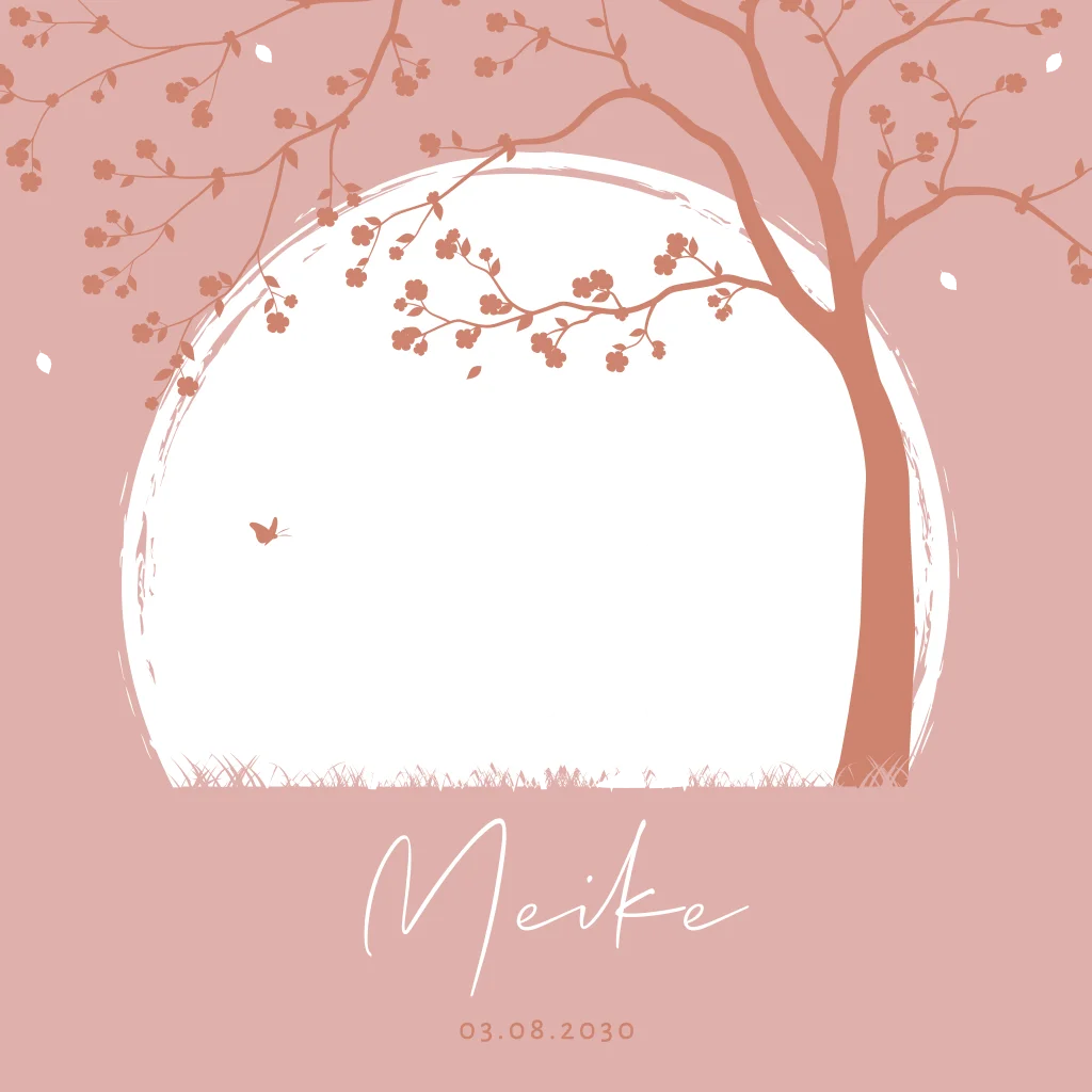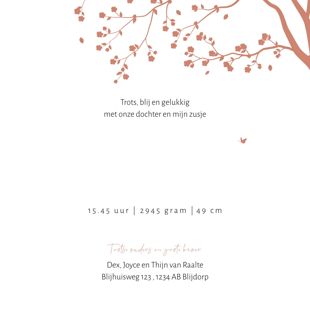 Lief geboortekaartje voor de geboorte van jullie dochtertje. Het kaartje heeft een silhouetje van een schattig wiegje met daarnaast de grote broer in roséfolie afgedrukt. De boom met takken en bloemen geven dit kaartje een lieve en romantische uitstraling.