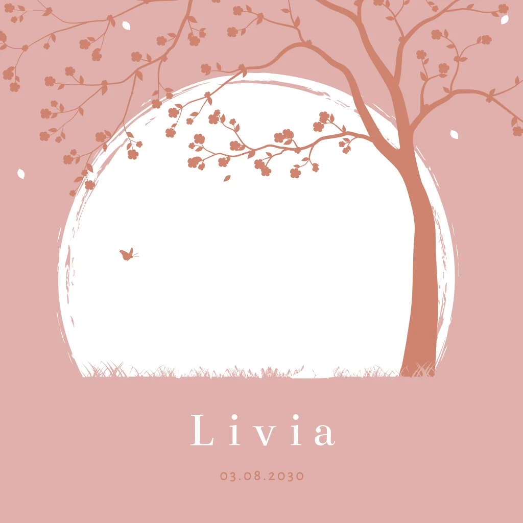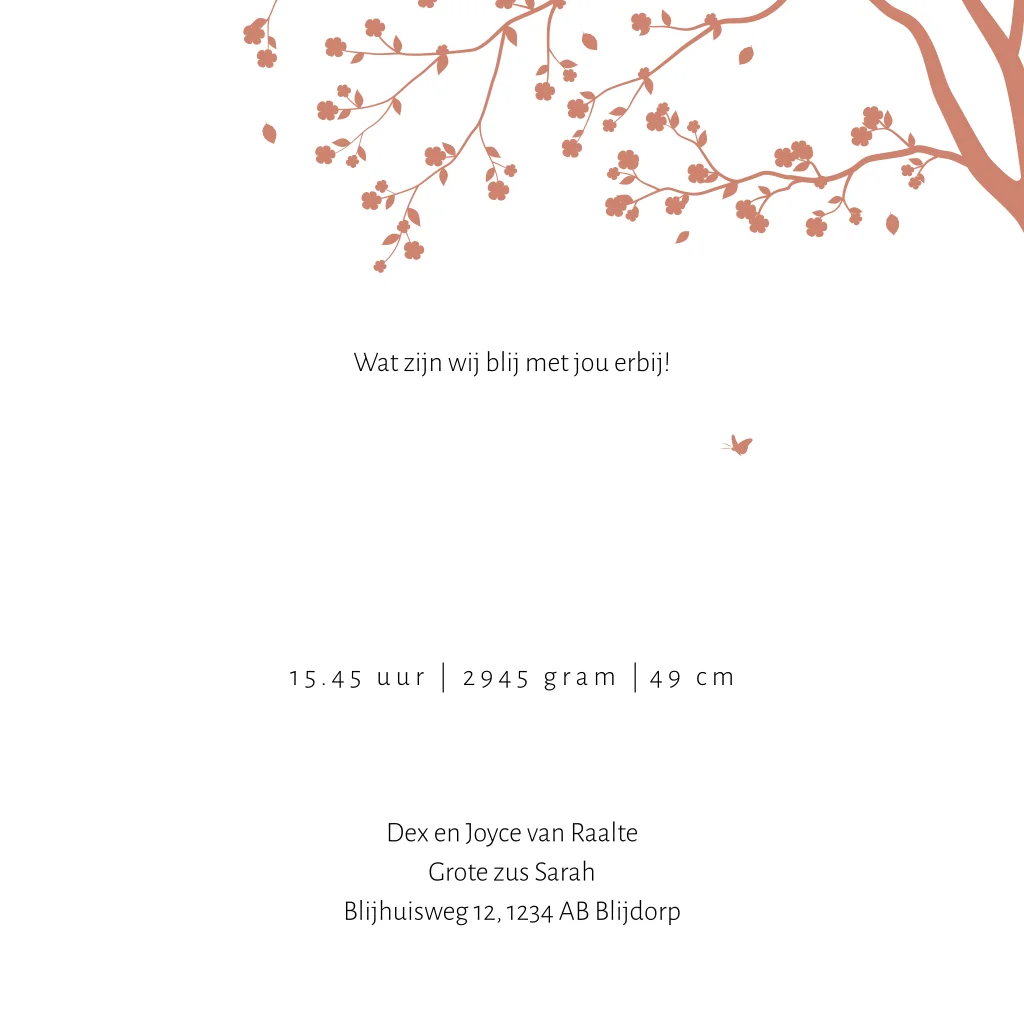 Romantisch geboortekaartje voor de geboorte van jullie tweede dochtertje. Grote zus staat bij het wiegje van de baby afgedrukt in roséfolie. De sfeervolle boom met takken en bladeren maken dit kaartje extra romantisch.