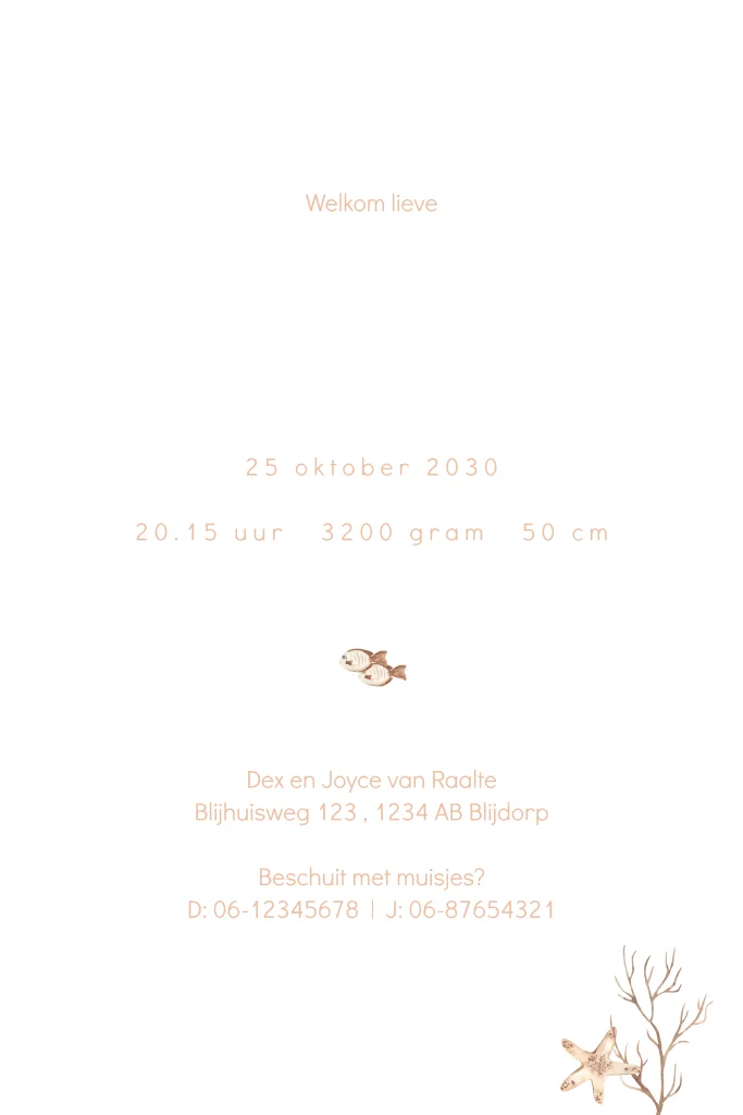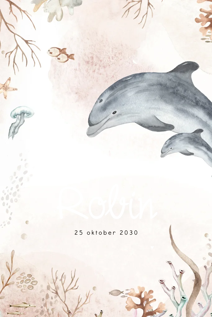 Een vrolijk en lief geboortekaartje voor jouw kindje. Het kaartje heeft een lichtroze watercolour achtergrond met daarop prachtige onderwaterwereld illustraties. Zo zie je twee dolfijnen, koraal en kleine zeedieren. De naam wordt gedrukt in roségoudfolie. Pas het ontwerp naar wens aan in onze online editor.