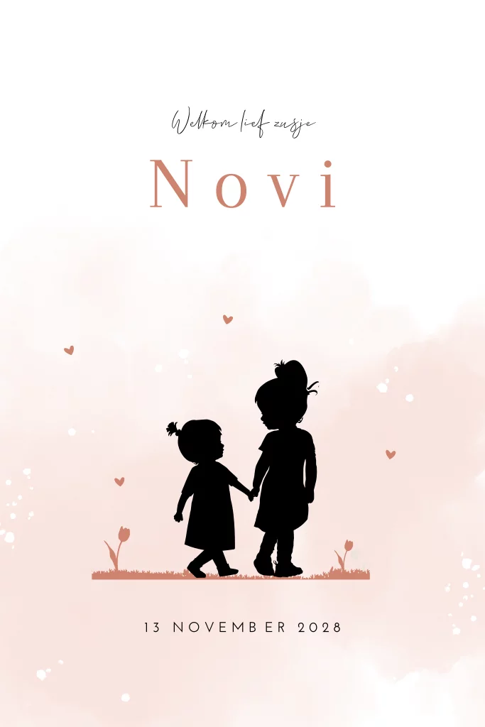 Dit is een lief geboortekaartje voor jullie dochter en zusje. Het kaartje heeft een lichtroze watercolour achtergrond met de silhouetjes van twee zusjes die hand in hand lopen. Het kaartje kan naar wens aangepast worden in onze online editor.